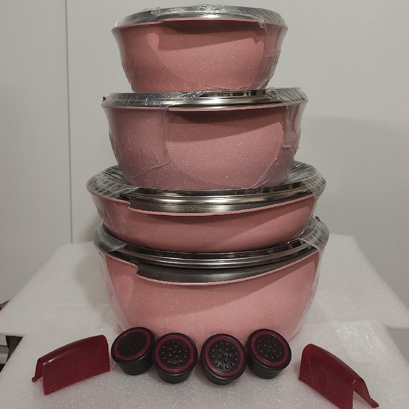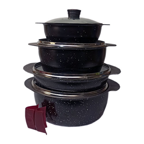 مشخصات سرویس قابلمه 10 پارچه چدن گرانیتی SPSاین سرویس قابلمه دارای بدنه بادوامی است که میتواند در برابر حرارت مقاومت بالایی داشته باشد. این سرویس از سه قابلمه با سایزهای متفاوت بهره میبرد که شما میتوانید با توجه به حجم و نوع غذا و تعداد اعضای خانواده قابلمه مناسب را انتخاب کنید. این قابلمهها در ابعاد ۲۰، ۲۴ و ۲۸ سانتیمتر تولید شدهاند. همچنین میتوانید از یک تابه ۲۸ سانتیمتری نیز برخوردار شوید. هر سه قابلمه و تابه همگی دارای دو دسته هستند که از جنس خود بدنه است و بهصورت یکتکه تولید شده است. این مزیت باعث میشود که دیگر نگران سوختن، شکستن یا آسیبدیدن دستههای ظروف نباشید.در این سرویس نیز برای قابلمهها سه عدد درپوش طراحی شده است که از جنس پیرکس نشکن هستند. درپوشهای شیشهای شفاف به شما امکان میدهند که روند پخت غذا را بدون نیاز به برداشتن آن مشاهده کنید. پوشش گرانیت داخلی قابلمهها دارای مقاومت بالا هستند که ظرف را در برابر خش، خمشدن و ضربه محافظت میکند. در کنار بدنه مقاوم و طراحی مناسب این سرویس، قیمت آن نیز بسیار مناسب در نظر گرفته شده است.