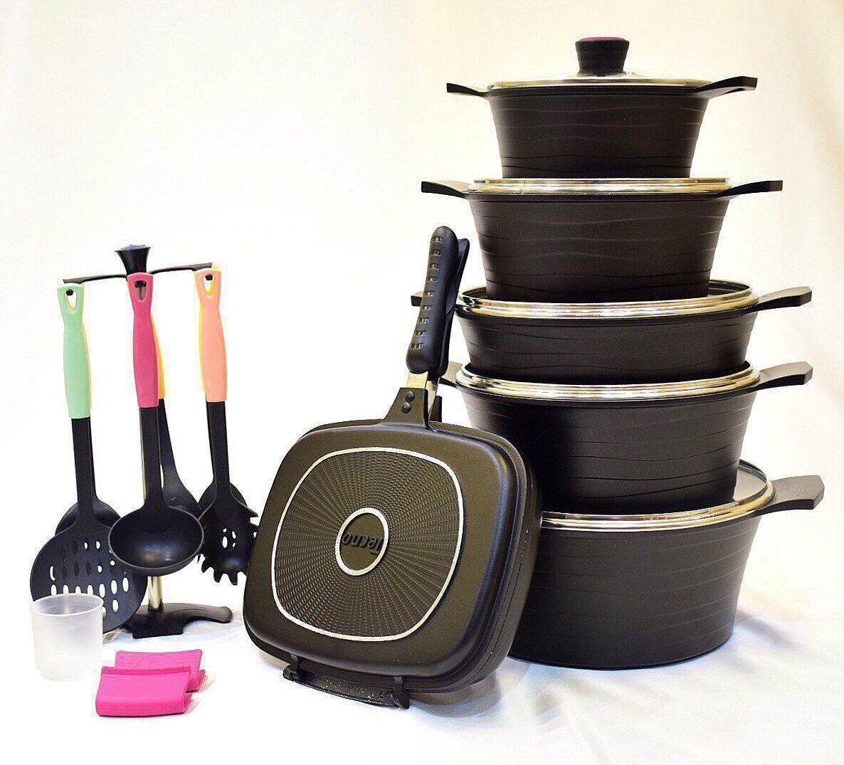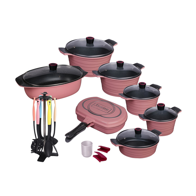 سرویس پخت و پز 24 پارچه تکنو مدل ونوس شامل چهار عدد قابلمه سایز 20، 24، 28 و 32 و یک عدد تابه سایز 28 و یک تابه رژیمی سایز 33، یک رستر به همراه ست کفگیر ملاقه، یک جفت دستگیره سیلیکونی و یک پیمانه مدرج است. پوشش درونی تابه ها و قابلمه ها از گرانیت نچسب و پوشش بیرونی آن ها رنگ پودری الکترواستاتیک می باشد. بدنهی داخلی این سرویس خاکستری رنگ است و تفکیک رنگی آن براساس بدنهی خارجی صورت میگیرد. کفی تمام ظروف ضخیم است و انتقال حرارت بهصورت کاملا یکنواخت انجام میشود؛ درنتیجه مواد غذایی یکدست پخته میشوند. درپوشهای این ست از شیشه هستند و با رینگ استیل پوشیده شدهاند و برای خروج بخار از ظروف یک سوپاپ ریز روی آنها تعبیه شده است. در کنار این ظروف یک ست ابزار آشپزی 6 پارچه بههمراه استند دارید که برای این ظروف نچسب باید از آن استفاده کرد. یک جفت دستگیرهی سیلیکونی نیز در این سرویس دارید که برای جابهجایی ظروف قابلاستفاده است. برای اینکه سطح داخلی ظروف شما برای مدتهای طولانی سالم و بدون خش بماند، تلاش کنید که همیشه از ابزارهای آشپزی مناسب برای این ظروف استفاده کنید.